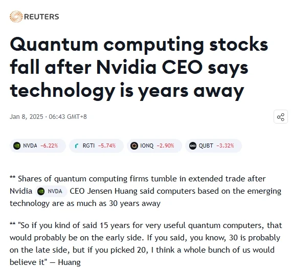 在CES展会上,黄仁勋不仅发布了备受业界期待的GeForce RTX 50系列GPU,也谈论了当前风头最劲的量子计算。