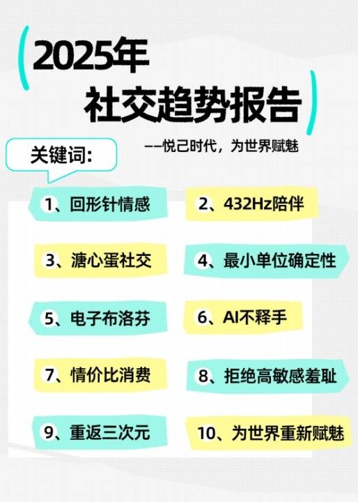 据介绍,《报告》基于11253份有效问卷、平台内容以及大数据等,总结了新社交趋势,并具象化为十个关键词。这些趋势包括:回形针情感、432Hz陪伴、溏心蛋社交、最小单位确定性、电子布洛芬、AI不释手、情价比消费、拒绝高敏感羞耻、重返三次元、为世界重新赋魅等。