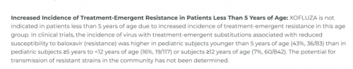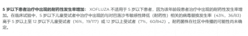 玛巴洛沙韦属于RNA聚合酶抑制剂,在其临床试验和实际应用中发现,玛巴洛沙韦治疗后,部分流感病毒可能出现I38T/M/F或E23K等变异,导致对药物的敏感性下降,从而产生耐药性。特别是在儿童患者中,耐药毒株的出现率显著增高,对于 12 岁以上的成人和青少年中为 7%,在 5 至 12 岁儿童为 16%,而小于 5 岁孩子中,竟能到达 43%。以上数据,和玛巴洛沙韦官网里面提到的是一样的[1]: