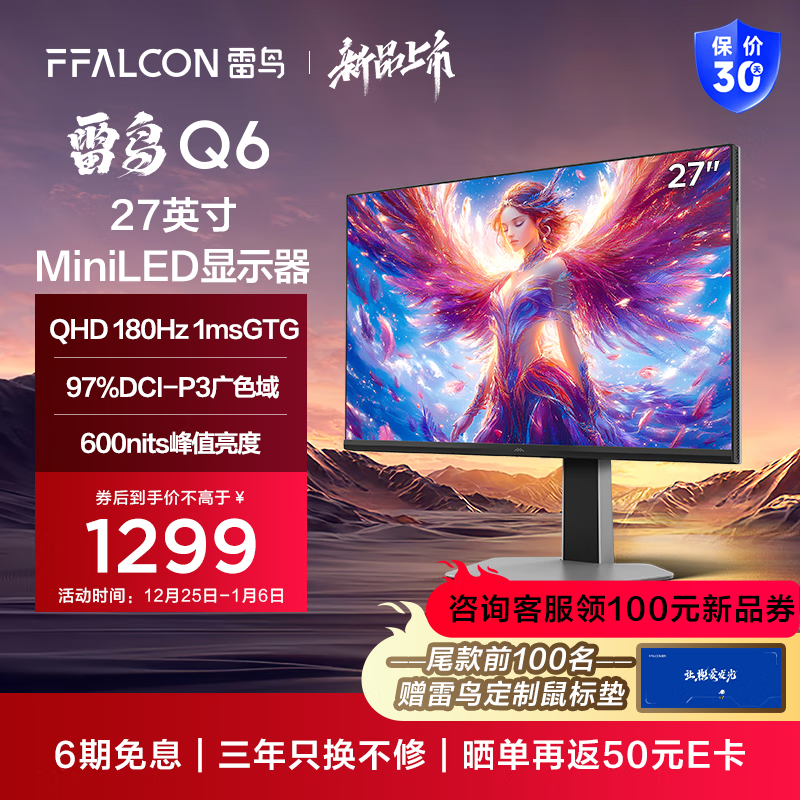 FFALCON雷鸟Q6:27英寸2K电竞显示器,180Hz+1ms响应,HDR600+灵活支架,1399元性价比之选