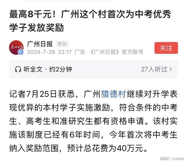 在2024年7月,据媒体报道,广州猎德村继续对升学表现优异的本村学子实施激励,符合条件的中考生、高考生和准研究生都有资格申请。该村实施该制度已经有6年时间,今年首次将中考生纳入奖励范围,预计总花费为40万元。