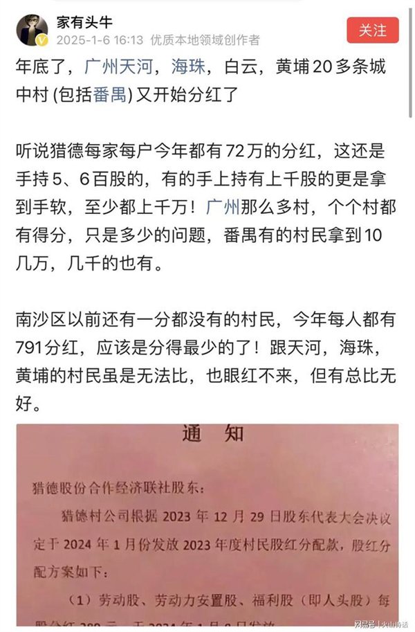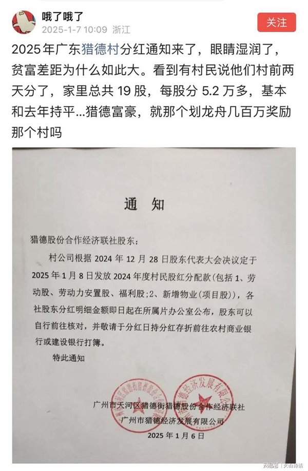 快科技1月8日消息,近日,一份关于2025年广州市天河区猎德村分红的通知,在网上又又又火了,引发网友的广泛关注。