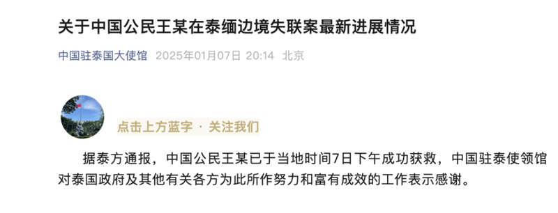 1月7日晚,中国驻泰国大使馆发布关于中国公民王某在泰缅边境失联案最新进展情况,据泰方通报,中国公民王某已于当地时间7日下午成功获救。