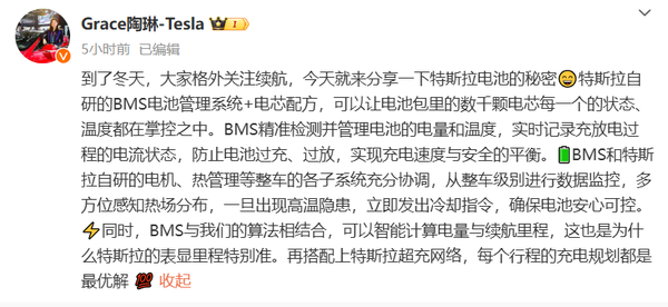 【CNMO科技消息】1月8日,特斯拉公司副总裁陶琳在微博上分享了关于特斯拉电池的秘密,尤其是在冬季续航方面的管理秘诀。冬天一到,大家对电动车的续航尤为关注,特斯拉自研的BMS电池管理系统加上独特的电芯配方,确保每颗电池的状态和温度都在掌控之中。