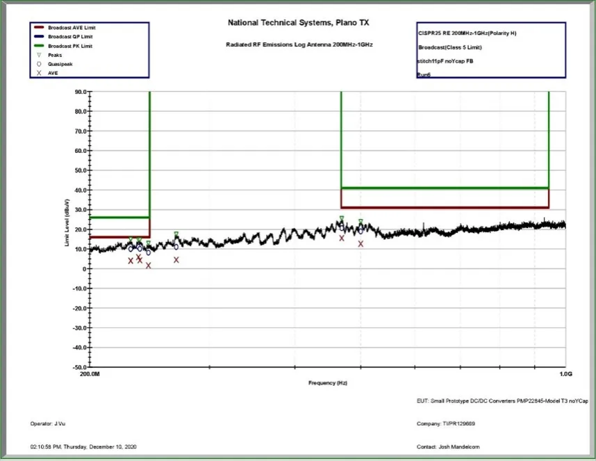 图 3. 无额外 Y 电容器的情况下,200MHz 以上辐射发射与 CISPR 25 5 类要求。此特定扫描未包含在隔离式 5V 参考设计测试报告中。电路板以大于 10dB 的裕度达到了限制要求