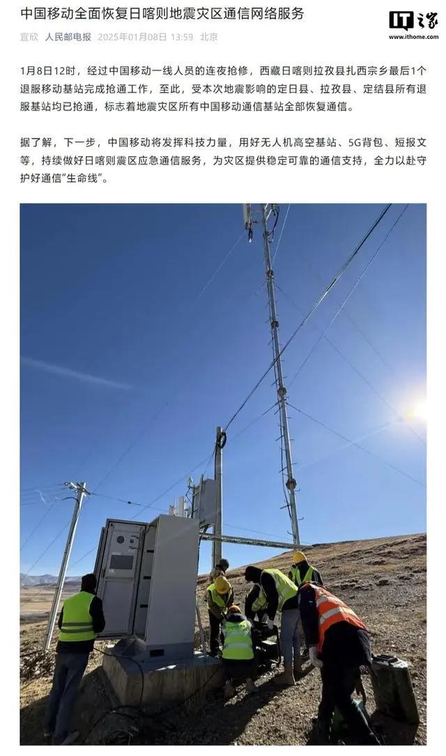 1 月 8 日消息,IT之家从《人民邮电报》获悉,今日 12 时,经过中国移动一线人员的连夜抢修,西藏日喀则拉孜县扎西宗乡最后 1 个退服移动基站完成抢通工作,至此,受本次地震影响的定日县、拉孜县、定结县所有退服基站均已抢通,标志着地震灾区所有中国移动通信基站全部恢复通信。