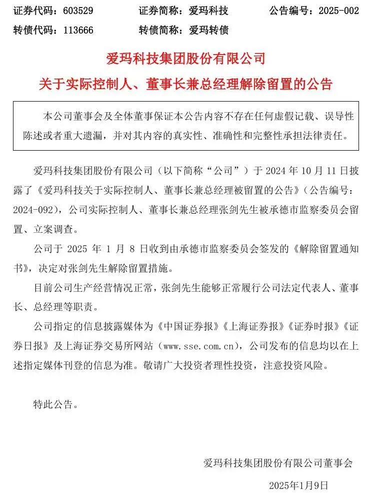 1 月 8 日消息,爱玛科技公告,公司于 2025 年 1 月 8 日收到由承德市监察委员会签发的《解除留置通知书》,决定对公司实际控制人、董事长兼总经理张剑解除留置措施。