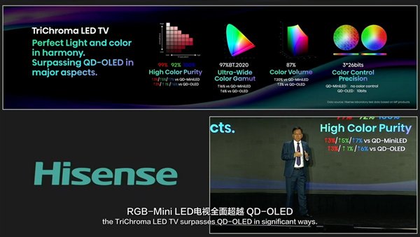 与此同时,相较于QD-OLED技术,海信RGB三维控色液晶显示技术在保持高色彩饱和度和广视角的同时,又避免了OLED屏幕寿命短、峰值亮度低等问题。