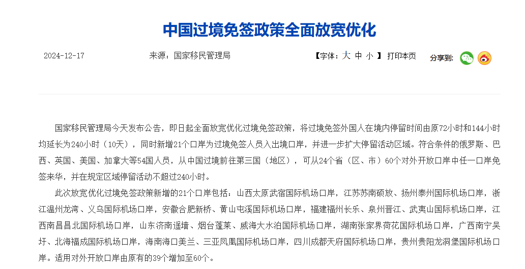 去年12月,我国将过境免签外国人在境内停留时间由原72小时和144小时均延长为240小时(10天),同时新增21个口岸为过境免签人员入出境口岸,并进一步扩大停留活动区域。