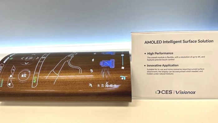 柔性AMOLED智能表皮解决方案,整体模组为柔性,分辨率高达4K,并带有精准触控,可用于需要曲面贴附的车内、家居场景。需要显示时,让显示无处不在;不需要显示时,将科技藏于自然纹理之下。