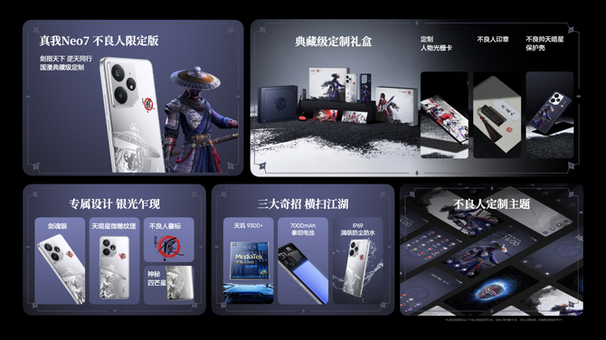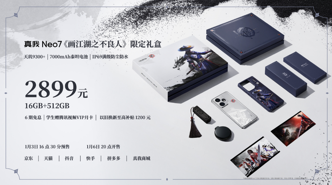 自2024年12月推出以来,真我Neo7以2099元的起售价成为首发价格最 低的天玑9300+机型,迅速占领中端市场。如今,realme再度携手经典国漫IP《画江湖之不良人》,推出真我Neo7不良人限定版,为粉丝们呈现国漫与科技的深度融合。这款备受期待的定制产品将于1月6日20:00正式开售,售价2899元。