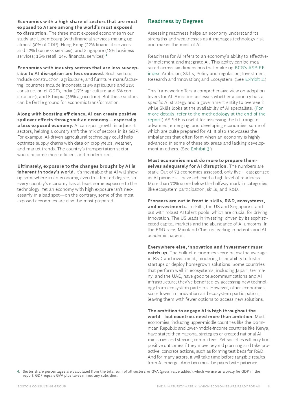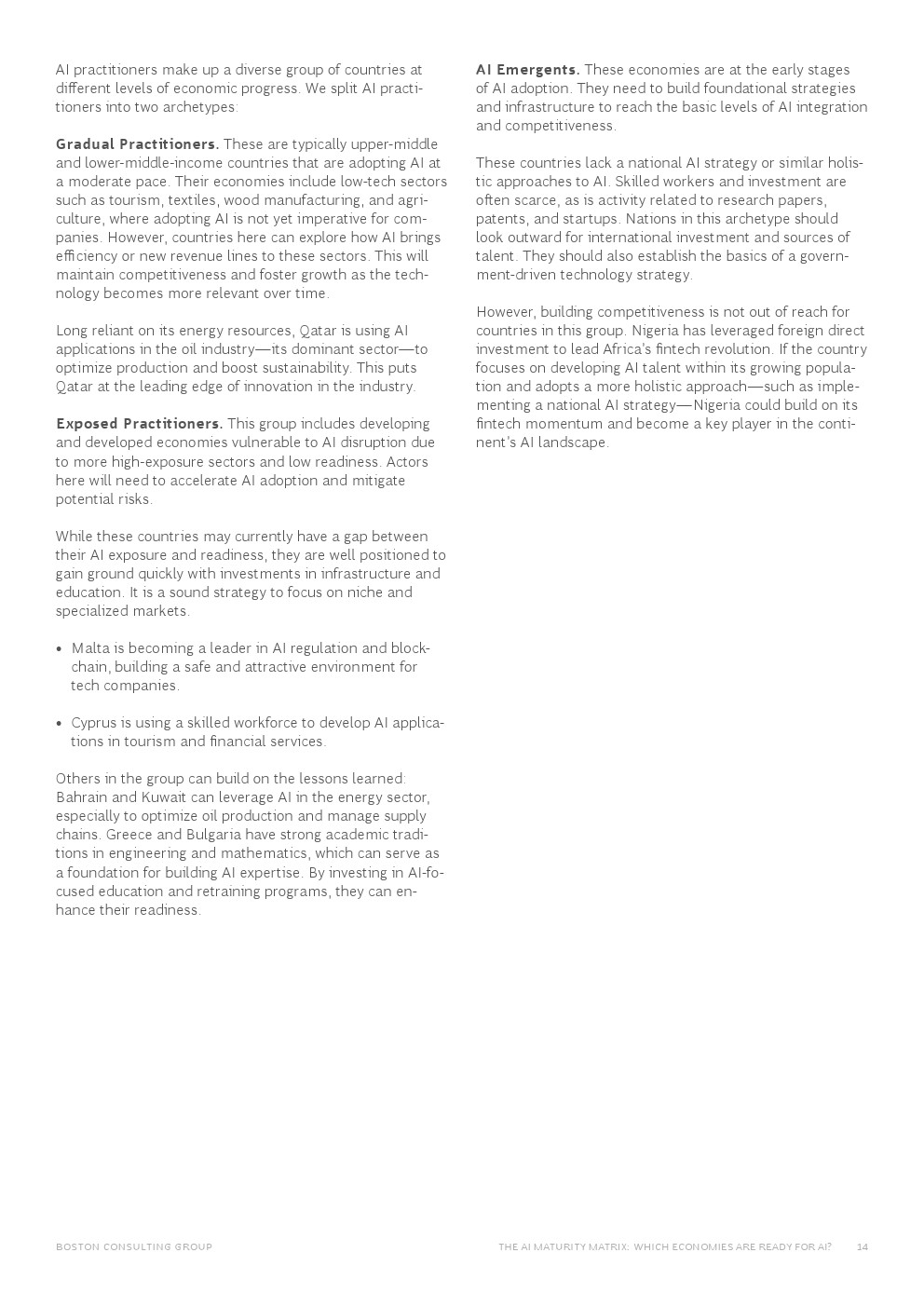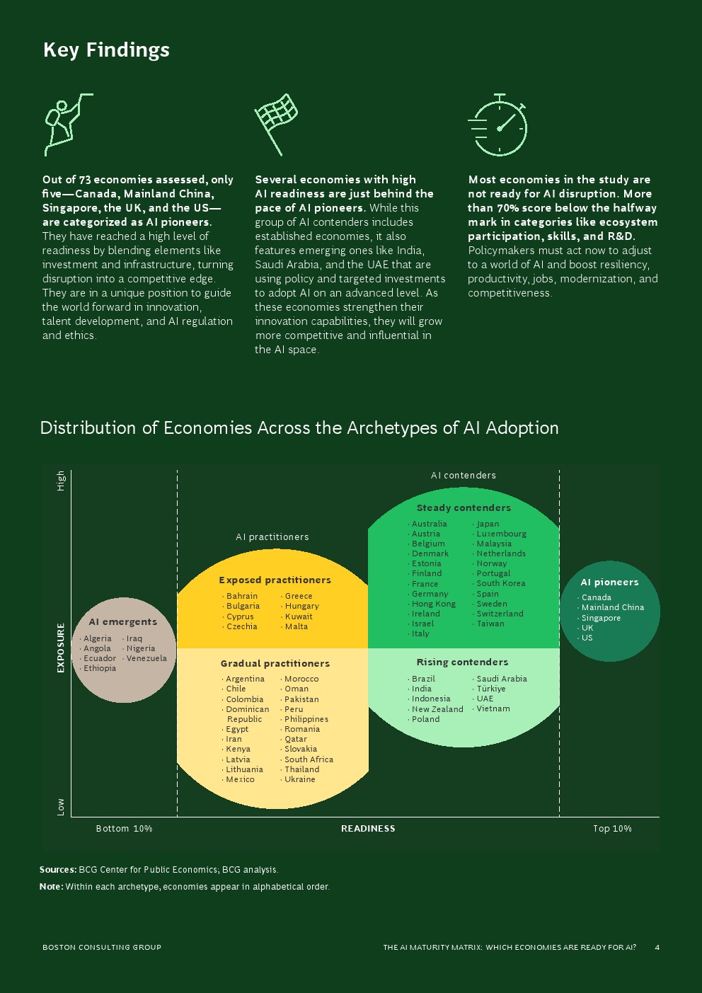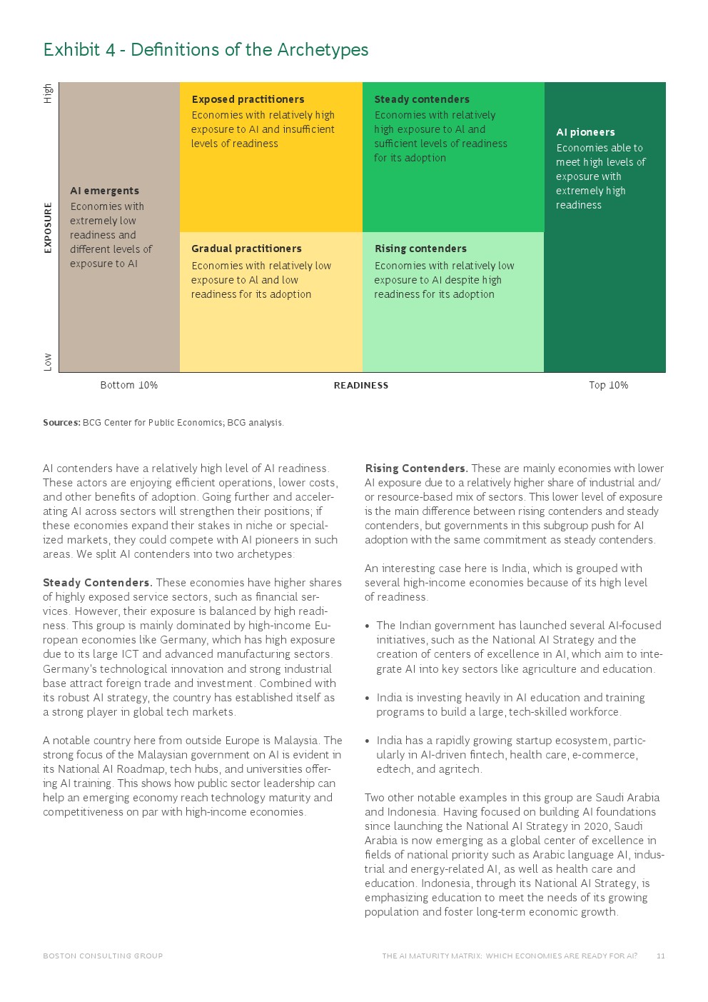 一些人工智能准备程度较高的经济体仅落后于人工智能先驱的步伐。虽然这组人工智能竞争者包括成熟的经济体,但也包括印度、沙特阿拉伯和阿联酋等新兴经济体,这些国家正在利用政策和有针对性的投资来采用先进的人工智能。随着这些经济体的创新能力不断增强,它们将在人工智能领域变得更具竞争力和影响力。