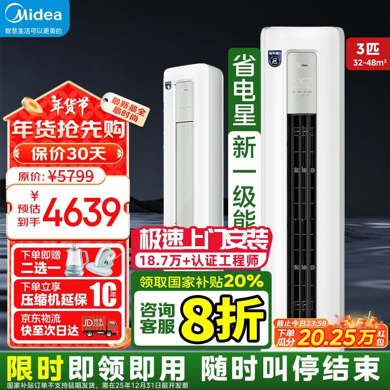 美的3匹一级能效立柜式空调仅4400多