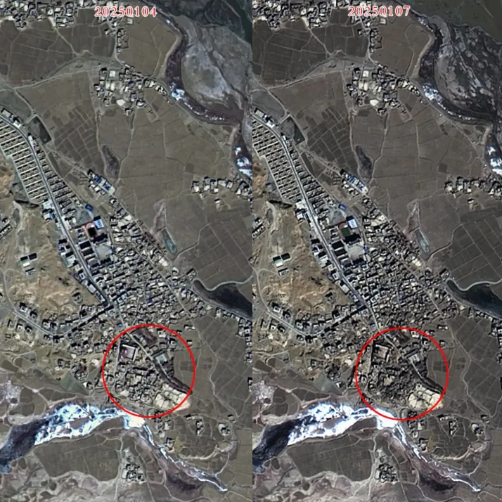 ▲ 西藏日喀则市定日县及周边地震受灾前后光学卫星图像(灾前:资源三号 03 星 2025 年 1 月 4 日采集,灾后:高分一号 03 卫星 2025 年 1 月 7 日采集)