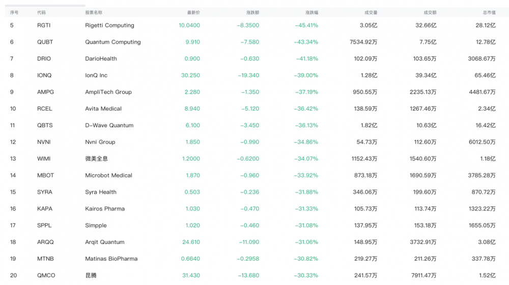 上述6家量子上市公司,均位居美股跌幅榜Top20。