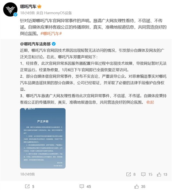 同时,针对近期哪吒汽车官网异常事件的声明。恳请广大网友理性看待,不信谣、不传谣。自媒体应秉持客观公正的传播原则,真实、准确地报道信息,共同营造良好的舆论氛围。