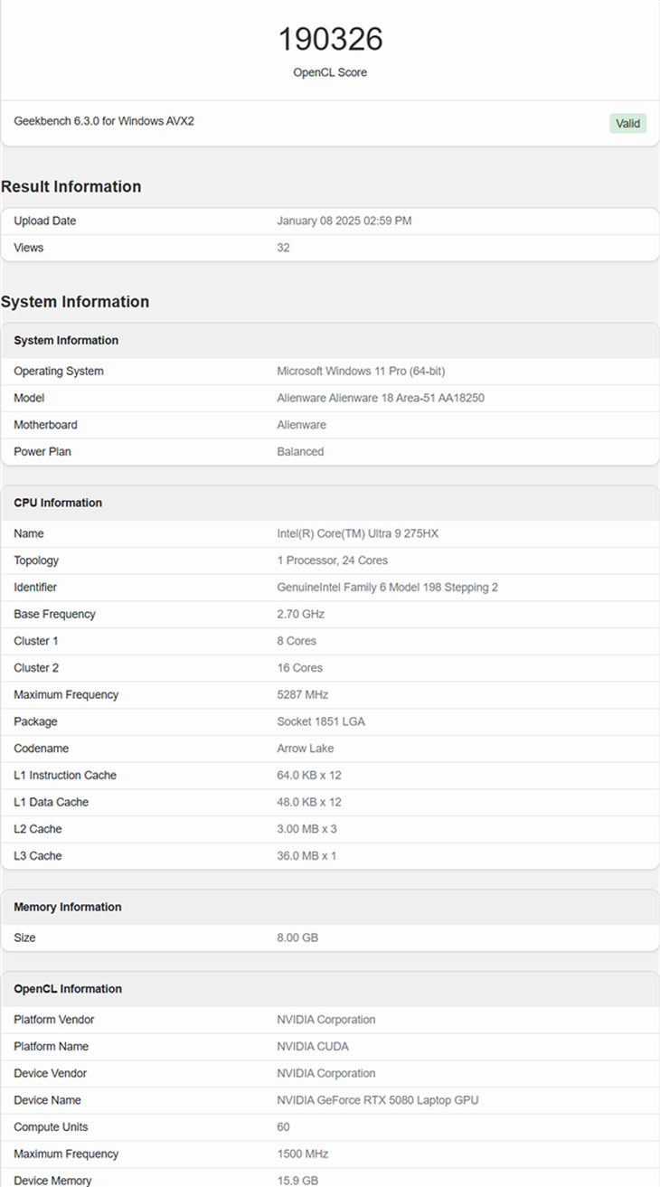 在最近举行的CES 2025展会上,英伟达的全新RTX 5080移动版显卡的Geekbench跑分首次曝光。虽然目前RTX 50系列显卡的详细评测尚未解禁,但一款搭载RTX 5080移动版显卡的外星人Alienware 18 Area-51笔记本已经出现在Geekbench数据库中,为我们提供了关于这款显卡初步的性能数据。