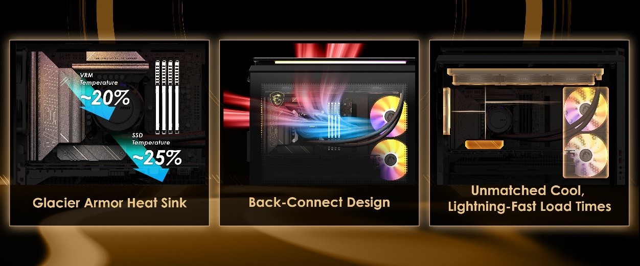 此外,电压调节模块(VRM)、固态硬盘(SSD)和内存均配备了GlacierArmor散热片,显著提升了散热性能。与未配备散热模块的型号相比,温度降低了高达25%,确保组件即使在重负载下也能保持优质性能。