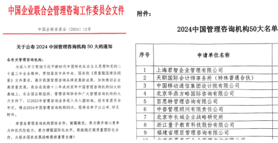 12月8日,中国企业联合会隆重揭晓了“2024中国管理咨询机构50大”名单。这一榜单已经连续十二年发布,以咨询业务收入为重要衡量标准,并经过专家委员会的严格审定。它不仅展示了我国管理咨询行业的最新发展成果,更彰显了这些机构在推动企业高质量发展、服务国家发展大局中的重要作用。