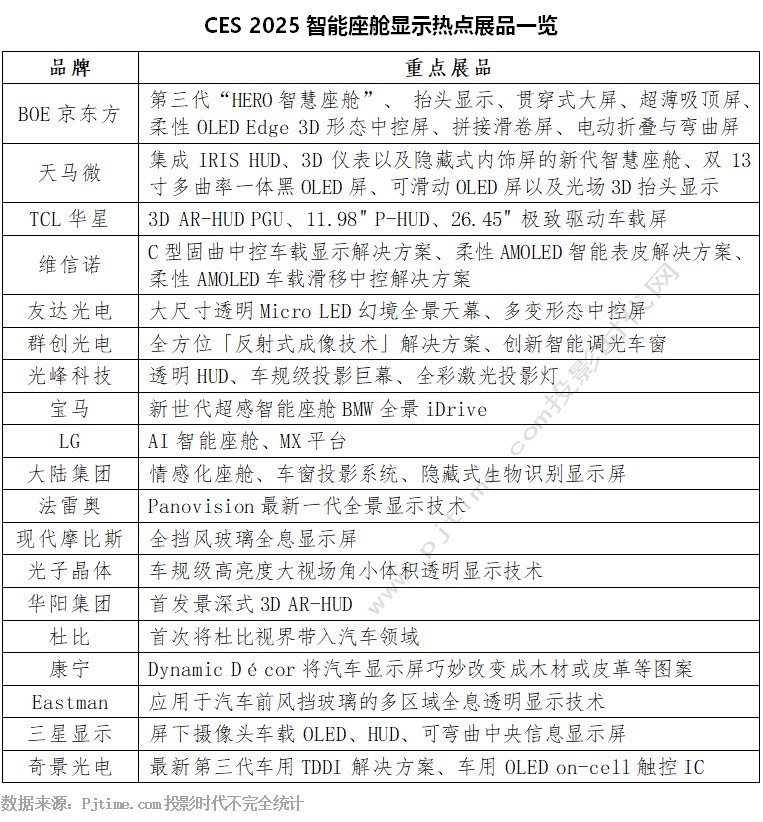 智能座舱是最能体现汽车科技感的领域,在主打科技的CES上,BOE京东方、天马微电子、维信诺、TCL华星、三星、LG、光峰科技、友达光电、群创光电、华阳集团、大陆集团、宝马等显示企业和车企也都将重点放在这一领域,今年智能座舱显示领域亮点是Micro LED、OLED、全景、全息、柔性、滑动、卷曲等是热点,下面Pjtime.com盘点CES 2025上有代表性的热点创新产品。