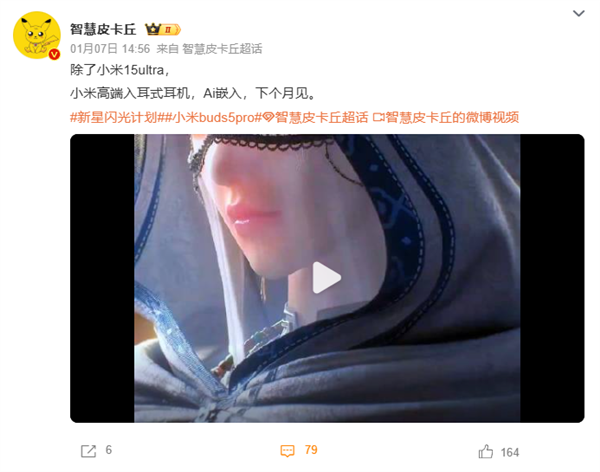 耳机新品预计为小米Buds 5 Pro,博主“智慧皮卡丘”此前爆料,小米有一款高端入耳式耳机将在2月发布,支持AI技术。