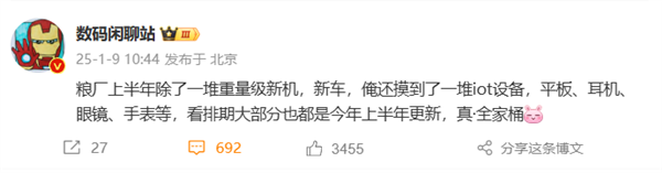 今日,数码博主“数码闲聊站”透露,2025年上半年,小米将发布一系列新品,除了重量级新手机、新车外,还有平板电脑、耳机、智能眼镜、智能手表以及智能家居等多领域产品,可以说是小米全家桶了。