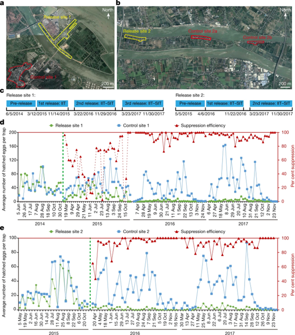 通过维持一定时间的优势比例,最终实现了对野外蚊子种群的压制,达到控制甚至根除传病蚊种的效果。在两年的时间里,团队释放了数百万只“绝育雄蚊”,成功使这两个居民区的野生白纹伊蚊种群几乎完全消失。