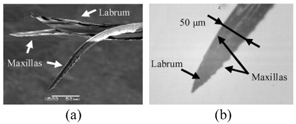 蚊子口器的扫描电镜图像,显示上颌骨和盂唇的元素