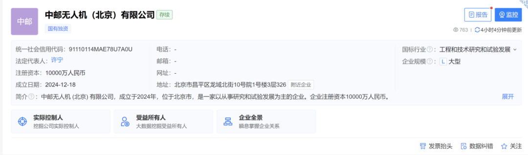 据了解,中邮无人机(北京)有限公司法定代表人为许宁,由中国邮政集团有限公司旗下中国邮政速递物流股份有限公司全资持股,注册资本达 1 亿元人民币。经营范围含智能无人飞行器制造、智能机器人的研发、智能机器人销售、人工智能硬件销售、人工智能通用应用系统、人工智能行业应用系统集成服务等。