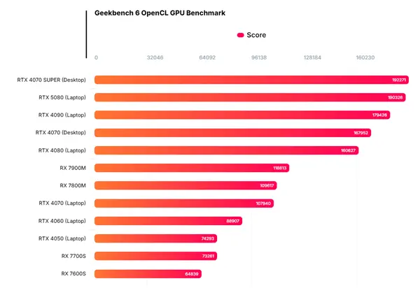 结果显示,RTX 5080移动版在OpenCL测试中的得分为190326分,相较于现有的RTX 4090移动版高出约6%,而与RTX 4080移动版相比则提升了18%,与桌面版显卡相比和RTX 4070 SUPER相当。