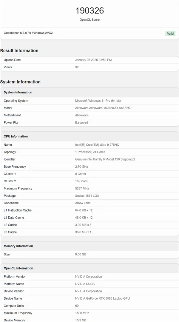 目前英伟达RTX 50系列显卡的评测暂未解禁,但还是有一款搭载RTX 5080移动版显卡的外星人Alienware 18 Area-51笔记本出现在了Geekbench上。
