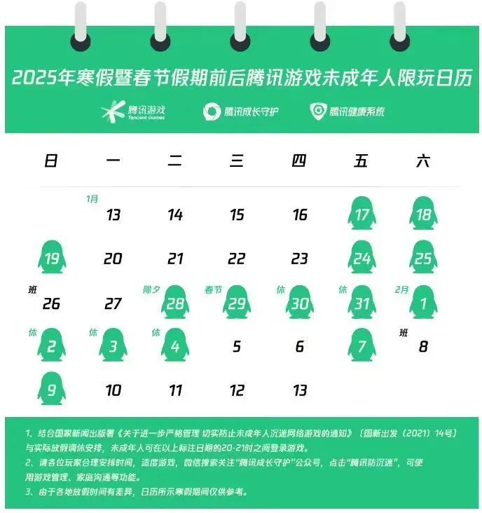 1 月 9 日消息,腾讯今日发布 2025 年寒假暨春节假期前后未成年人游戏限玩通知,未成年人可在以下标注日期的 20-21 时之间登录游戏,也就是最多 15 个小时。