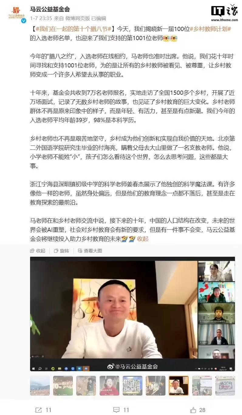 1 月 9 日消息,据马云公益基金会 1 月 7 日晚消息,新一届 100 位马云公益基金会乡村教师计划的入选老师名单揭晓,马云基金会迎来了第 1001 位乡村教师。马云也如约而至,与 1001 位乡村教师一起在线参加了今年新入选教师的揭晓典礼,一起度过了这个“腊八之约”。