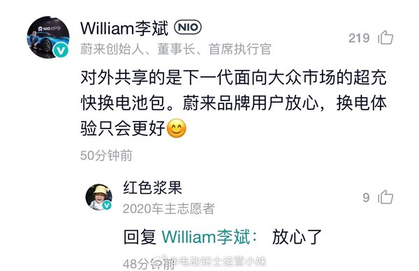 对此,蔚来董事长李斌曾向车主回应称:对外共享的是下一代超充快换电池包,蔚来品牌用户放心,换电体验会更好。