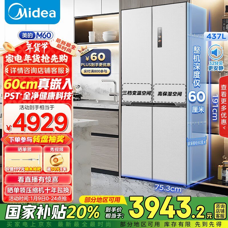美的M60全净系列冰箱国补返卡价3683元