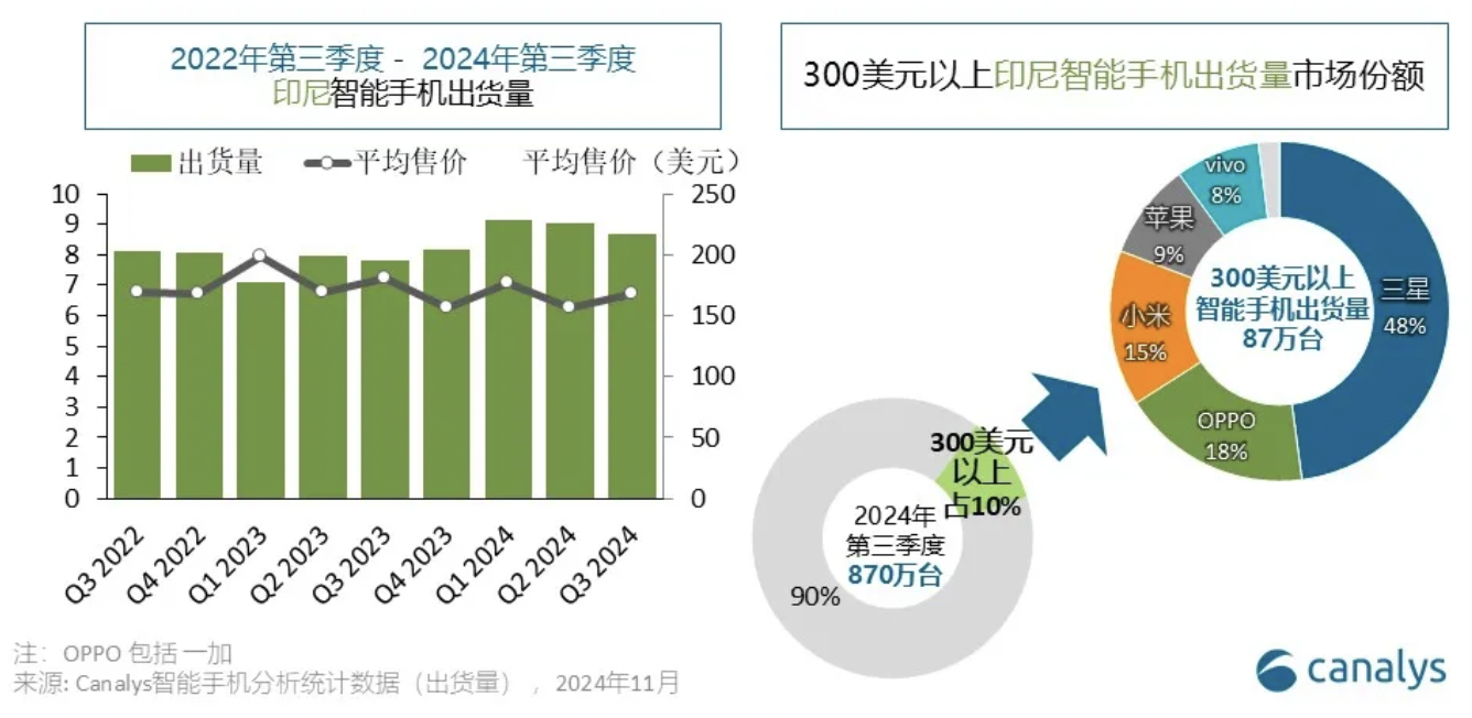 “得印尼者得东南亚”,作为东盟经济体量最大的国家,印尼早已成为众多手机品牌厂商争抢的战略高地。根据市场调研机构Canalys报告,2024年第三季度,印尼手机市场增长11.3%,出货量达870万部,占东南亚市场的35%,其中中国厂商在印尼的市场占有率超过七成。