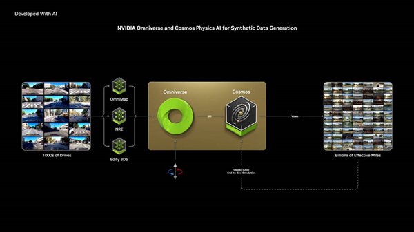 为了突破这个障碍,英伟达本次在发布会上提出了一个全新的解决思路:先投入海量资源,先打造一个靠谱的世界模型(通过大量图像、音频、视频和文本数据训练,让机器对世界运作方式能够进行推理),然后部分结合现实司机驾驶数据,数字孪生相关的各种资源,最终生成几何倍数于真实数据的虚拟驾驶数据。