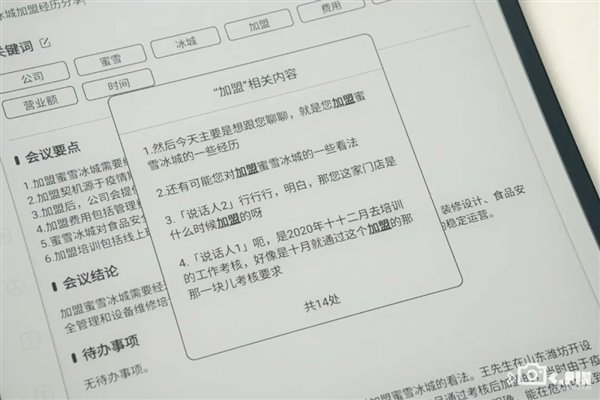 现在,直接选【 加盟 】关键词,就能抓取相关的所有原话。点击句子,还能直接锁定原文录音。总结确定主体,语音追溯确认细节,双管齐下,一场会议就能快速啃下来了。