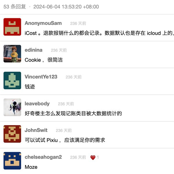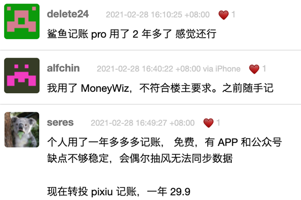 二呢,这么多 App 还没出现一家或两家独大的情况。去年有人在 v2ex 发了个帖子,让大伙儿推荐一款记账软件。结果世超在 53 条评论里,看到了 13 款记账 App 的名字。