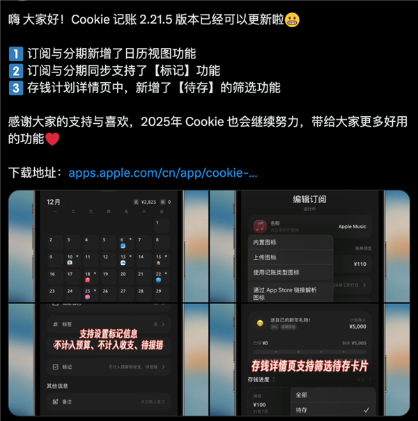 后来找到工作后,就用业余时间开发和维护。最后又辞职,全职开发钱迹。比如 Cush 记账,是由一个叫 Shasha 的开发者和小伙伴一起制作的。还有 Cookie ,也是由一个叫 wanbo 的独立开发者维护。