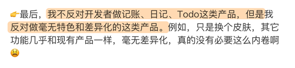 去年在即刻上,独立开发者 Kenny 也分享了一段自己的想法。他不反对开发者做记账、日记、 Todo 这类产品,但他反对做毫无特色的。比如只是换个皮肤,其它功能几乎和现有产品一样。