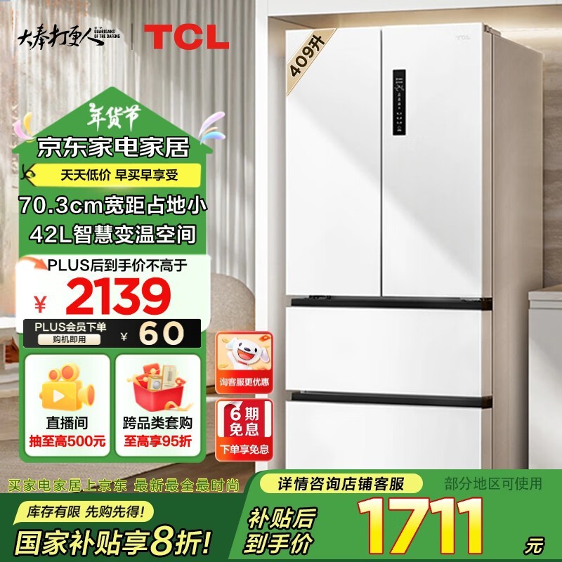 超值好价!TCL 409升白色四开门电冰箱1391元入手