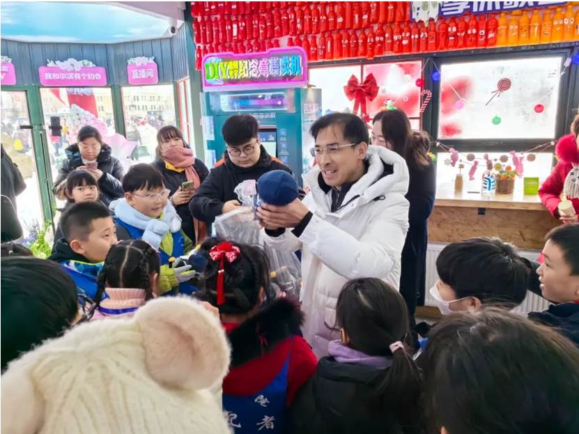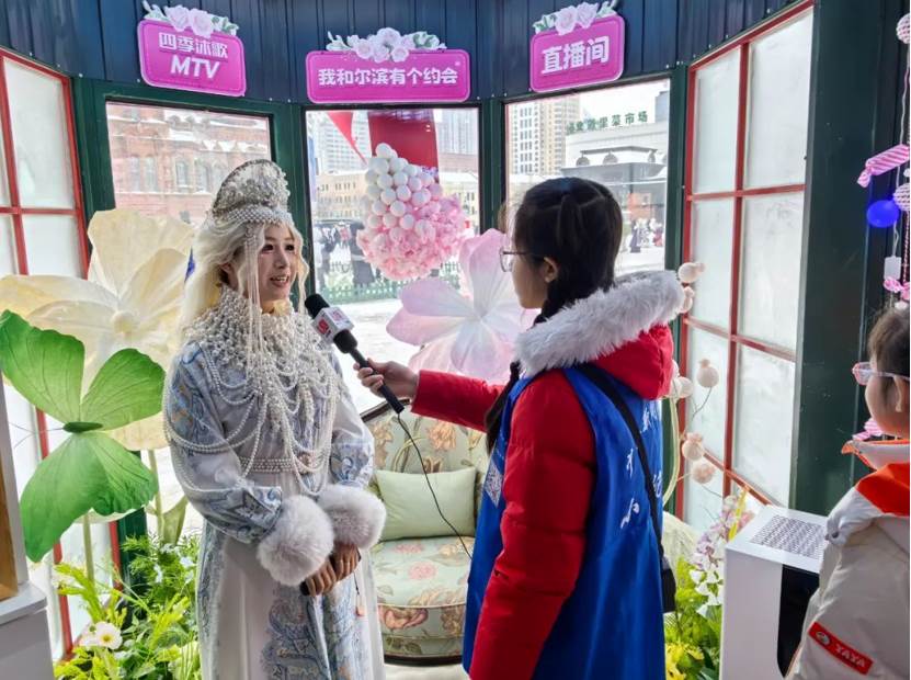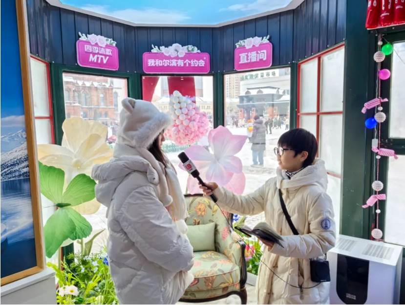 温暖驿站内,小记者们专注采访南方游客,捕捉对哈尔滨印象的珍贵回答