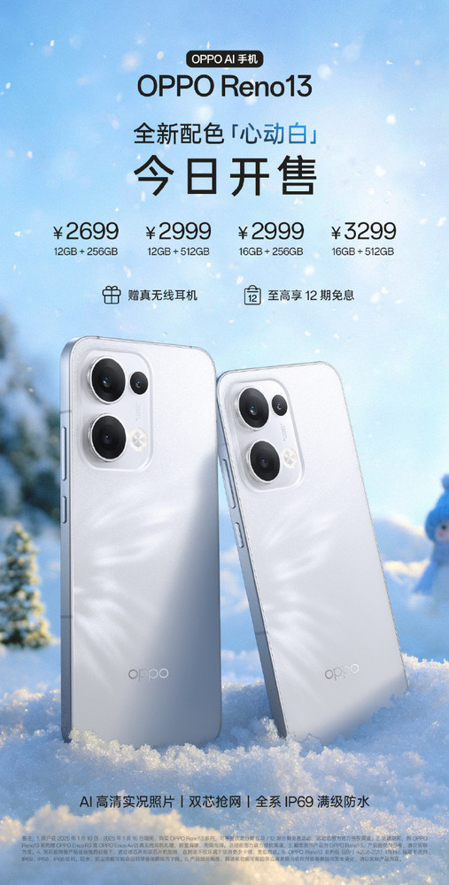 OPPO Reno 13心动白配色今日开售 起售价2699元