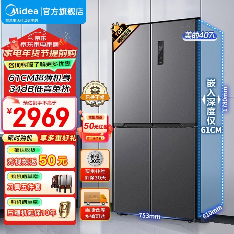 美的 BCD-407WSPZM(E) 风冷十字对开门冰箱 2969元入手