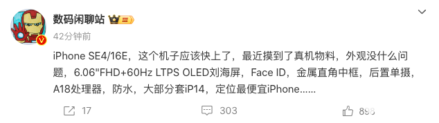 知名数码博主“数码闲聊站”爆料称,iPhone SE 4快发布了,机身正面搭载6.06英寸FHD分辨率,60Hz LTPS的刘海屏,采用OLED材质,支持Face ID。