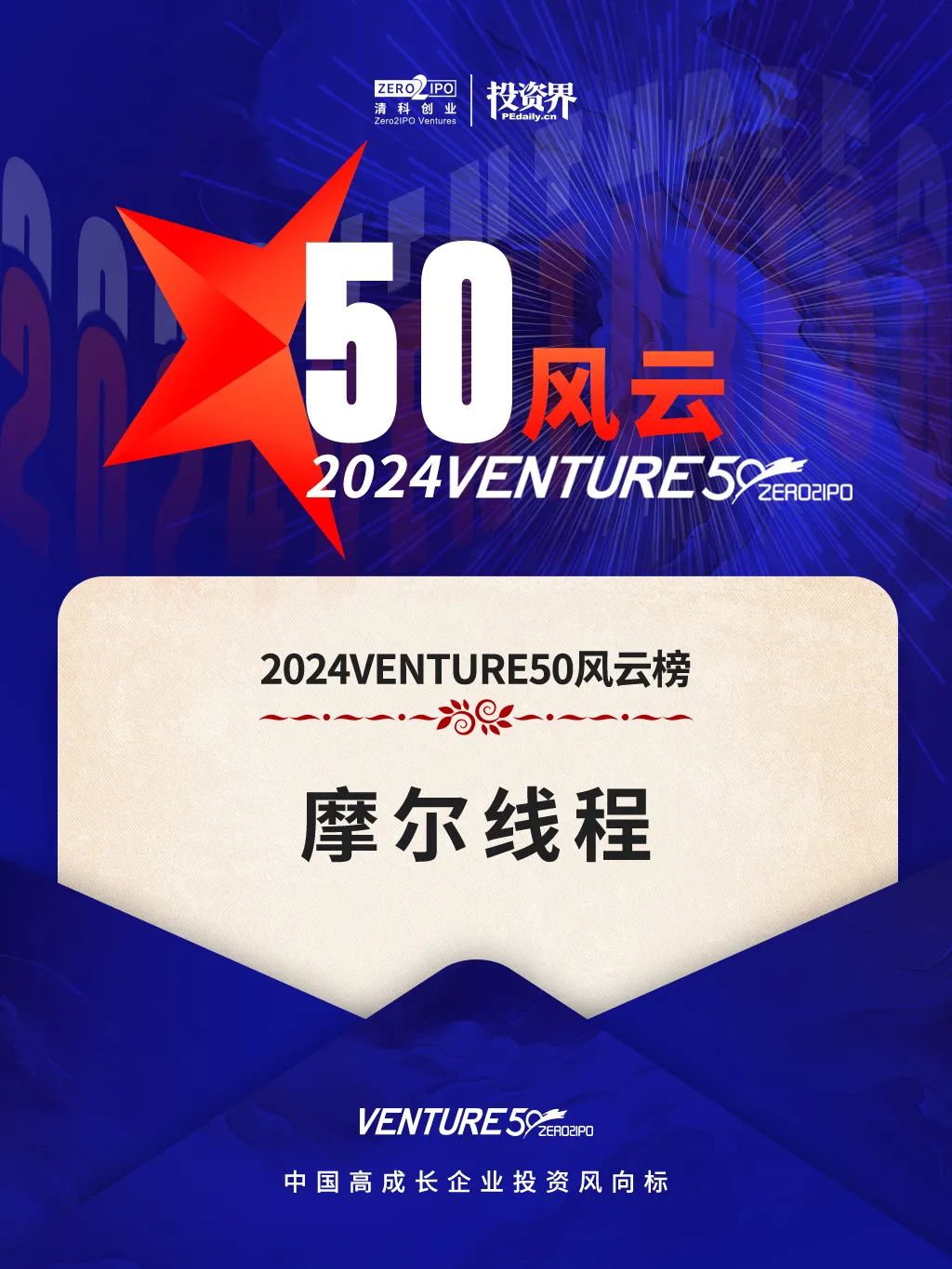 1月9日,由清科创业、投资界发起的2024VENTURE50评选结果重磅揭晓,其中洪泰基Family成员企业摩尔线程、无问芯穹、中茵微电子、XREAL、华晟新能源、国氢科技分别入选风云榜、新芽榜、人工智能、新能源新材料等多赛道榜单。