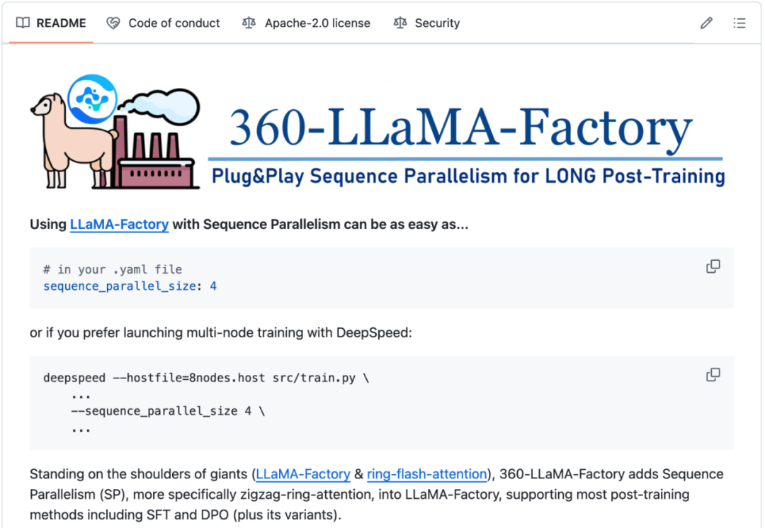 360 智脑开源了 360-LLaMA-Factory,支持了序列并行,仅需额外 1 个参数控制。基于 LLaMA-Factory 和 ring-flash-attention 开发,360-LLaMA-Factory 的实现模块化、效果正确且在长序列上有效。