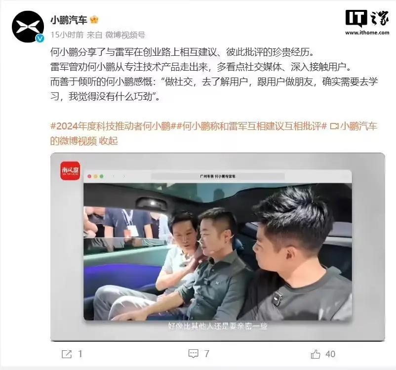 据南风窗 1 月 7 日报道,雷军曾劝何小鹏从专注技术产品走出来,多做点营销,多看点社交媒体、深入接触用户,何小鹏也直言“这点他做的远远比我好”。