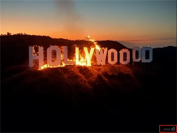 因为图片上该标志牌多了一个字母,变成了“HOLLYWOODD”,此外,部分传播的图片右下角还带有“Grok AI”的水印,表明其由马斯克旗下公司xAI开发的人工智能工具生成。